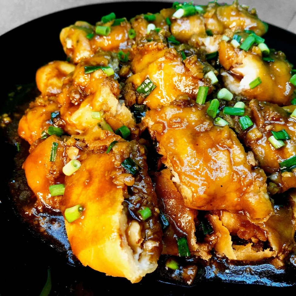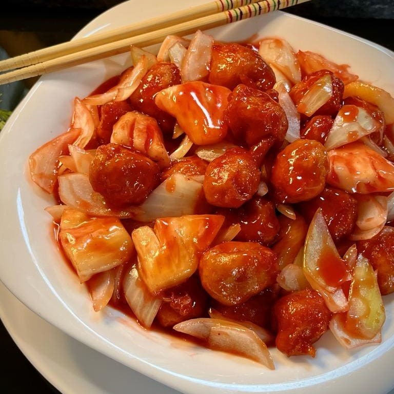 O nosso sofisticado 'Frango Agridoce', da categoria agridoce, esbanja sabor e qualidade. Este prato é composto por tenros pedaços de sassami de frango, envolvidos em uma massa leve e crocante, feita à base de ovos e farinha de trigo, cuidadosamente temperada. É servido com fatias frescas de abacaxi e cebola, que adicionam um toque exótico e refrescante. O molho agridoce, feito artesanalmente, traz um equilíbrio perfeito entre doce e picante. Este prato é bastante adocicado, portanto, sugerimos o Arroz Chop Suey como acompanhamento para uma experiência gastronômica completa e harmoniosa.
