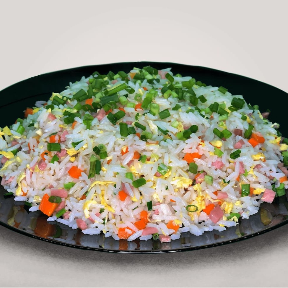O 'Arroz Chop Suey (Grande)' é um dos nossos 'Mais Vendidos'. Este prato é uma deliciosa combinação de arroz branco fumegante, perfeitamente cozido, com cenouras tenras e suculentas, e presunto em cubos, todos cuidadosamente salteados para liberar um aroma tentador. Acrescentamos ovos mexidos levemente salgados, que dão a este prato uma textura cremosa e agradável. Para finalizar, uma pitada de cebolinha fresca é polvilhada por cima, dando um toque de frescor e beleza. É uma explosão de sabores em cada garfada!