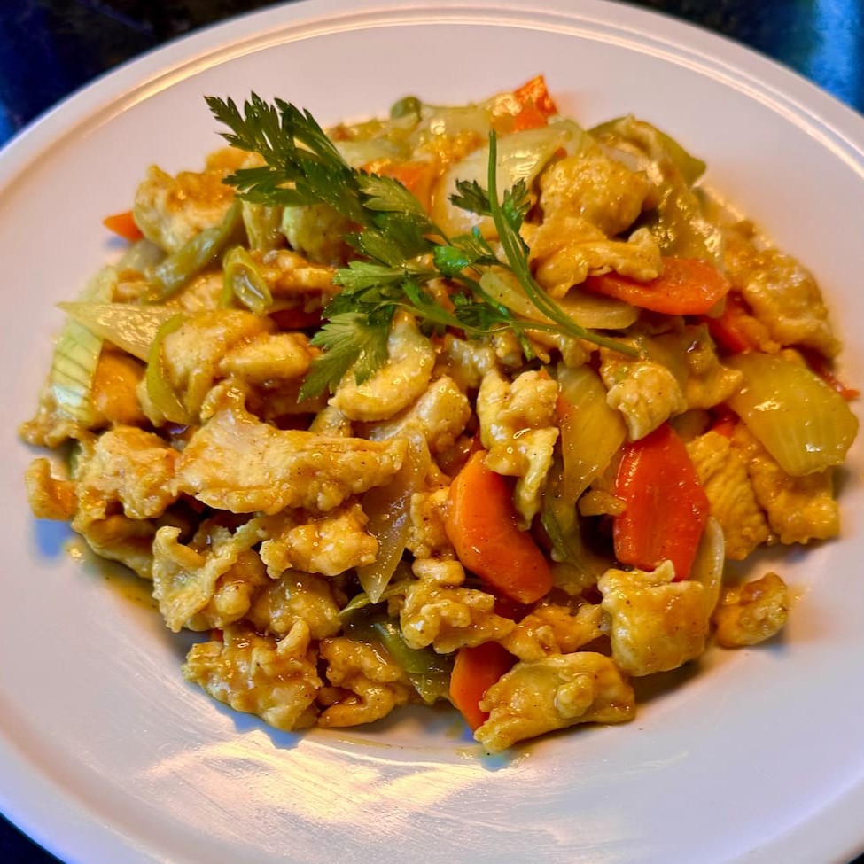 Este saboroso 'Frango ao Curry' e um equilíbrio perfeito de especiarias, o curry adiciona uma profundidade de sabor incomparável, enquanto a cebola e a cenoura, cuidadosamente selecionadas, incorporam uma textura crocante e um doce contraponto ao calor do curry. A ervilha, juntamente com a vagem, adiciona uma nota de frescor e cor, criando uma harmonia perfeita entre todos os ingredientes. Este prato é uma verdadeira celebração dos sabores do 'Curry'.
