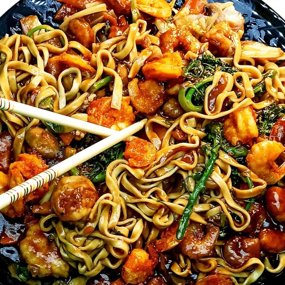 Saboroso Yakissoba de Camarão, cuidadosamente preparado com nosso macarrão oriental artesanal. Repleto de camarões suculentos, acompanhado por legumes extremamente frescos, como cenoura, brócolis, acelga, couve-flor, broto de bambu e champignon. Finalizamos este prato com um delicioso molho à base de shoyu e uma mistura harmoniosa de nossos temperos exclusivos. Uma verdadeira experiência culinária que destaca a riqueza dos sabores orientais.