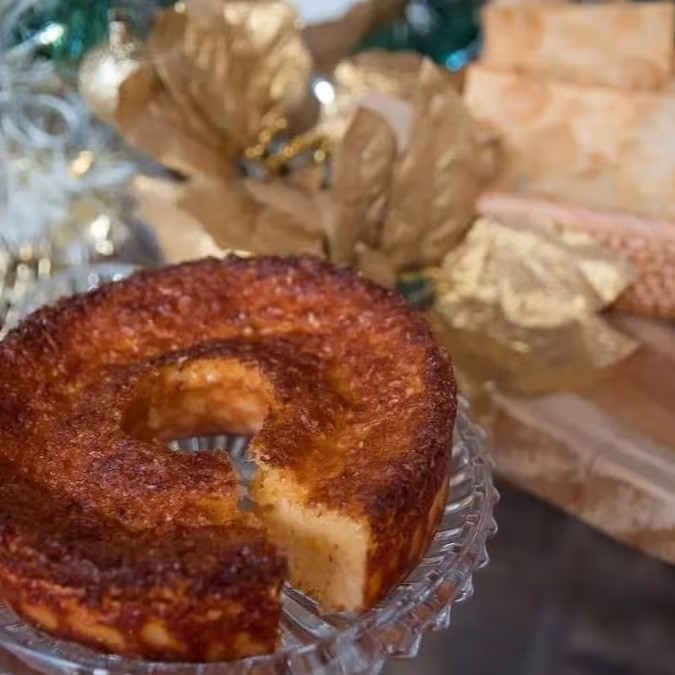 Uma fatia generosa do nosso bolo de milho verde, sem farinha, perfeita para um lanche saboroso e autêntico.