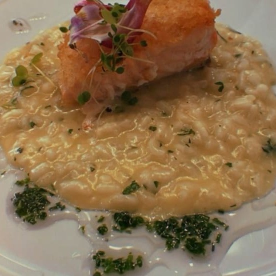 Arroz arbóreo, fundo de legumes, salmão grelhado, tomate grepe, queijo parmesão e crispe alho poró