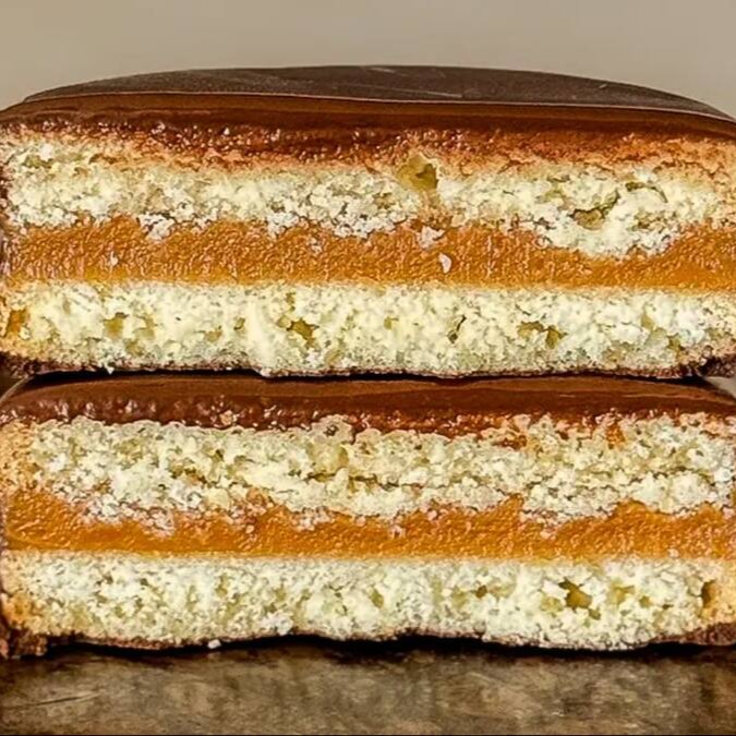 Duas camadas de biscoito amanteigado recheado com doce de leite e cobertos com chocolate.