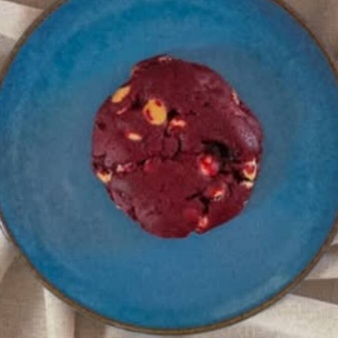 Cookie Red Velvet com gotas de chocolate branco, brigadeiro de cream cheese e geléia de frutas vermelhas 80gr