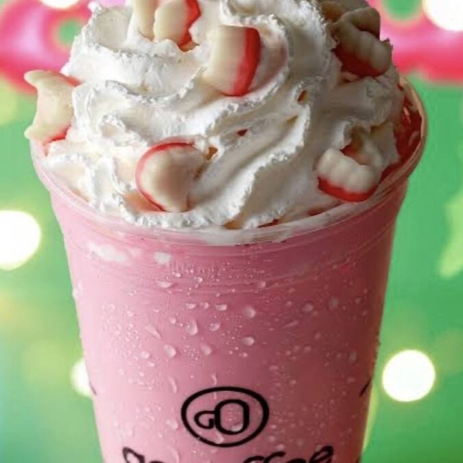 Frappe com leite +base creme + Xarope de Framboesa + Gelo + Chantilly e Bala Fini de Dentadura