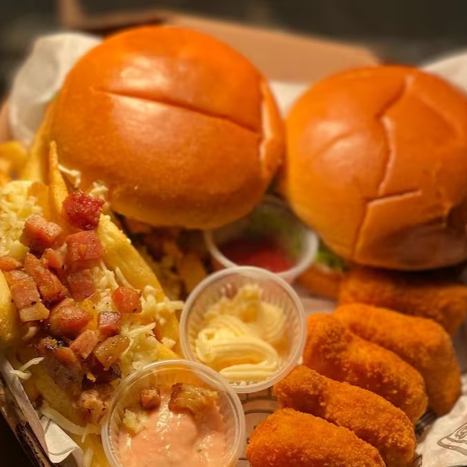Dois hamburgueres artesanais (pão de brioche,carne artesanal 100g,f cheddar,maionese defumada,bacon,alface e tomate) nuggets de frango empanado,batata frita com queijo e bacon+ molhos