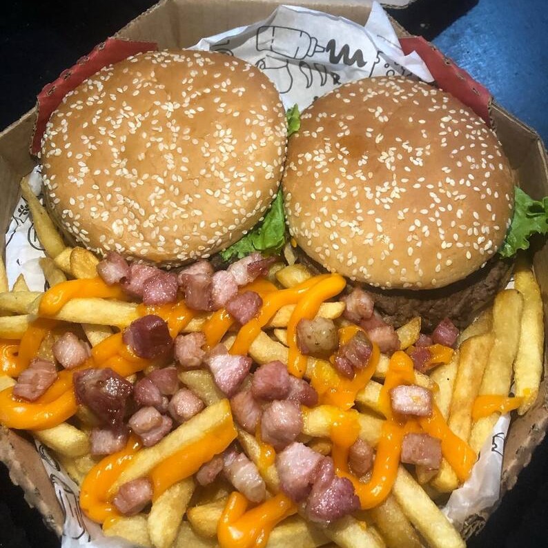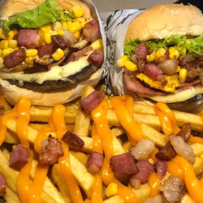 Dois hamburgueres artesanais (Pão com gergelim,blend bovino 100g, cheddar,maionese defumada,alface e tomate) 300g de batata frita com cheddar e bacon