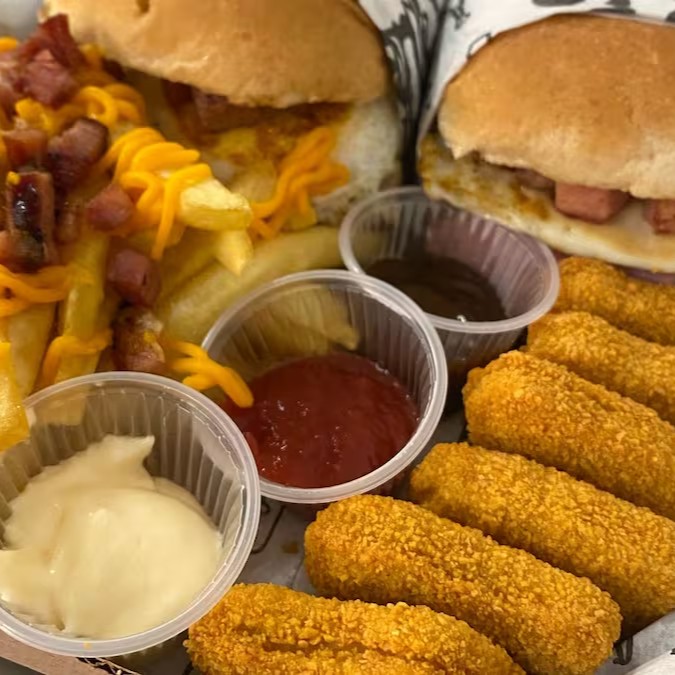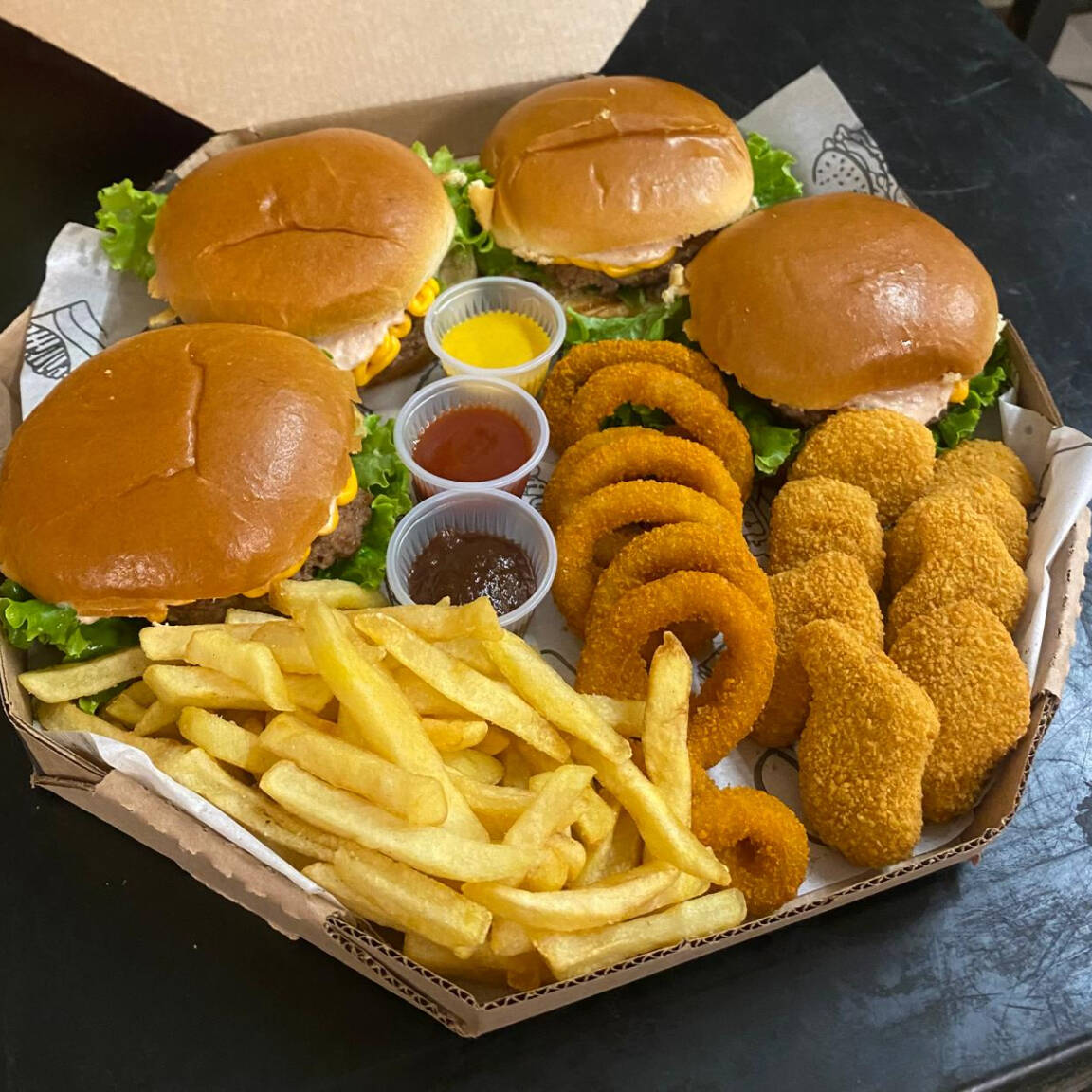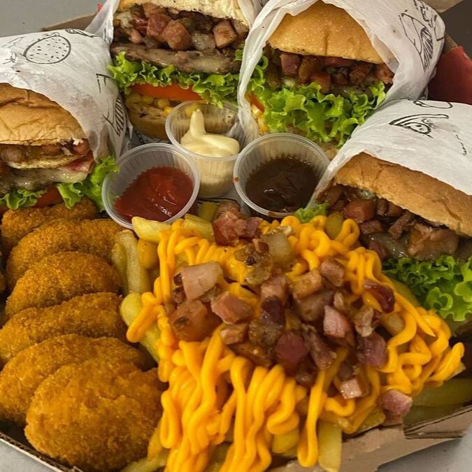 4 hamburgueres (Pão com gergelim,blend bovino 100g, cheddar,maionese defumada,alface e tomate) anéis de cebola,nuggets de frango empanado,batata frita e molhos