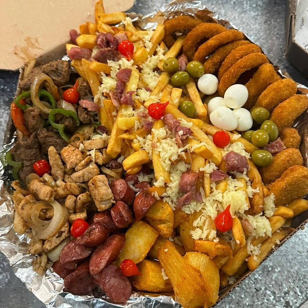 Batata frita com queijo e bacon,contra filé acebolado,lombo acebolado,filé de frango frito,linguiça calabresa,palmito,azeitona e ovo de codorna