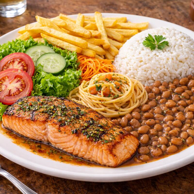 Arroz,feijão carioca,macarrão,batata frita,salada e salmão