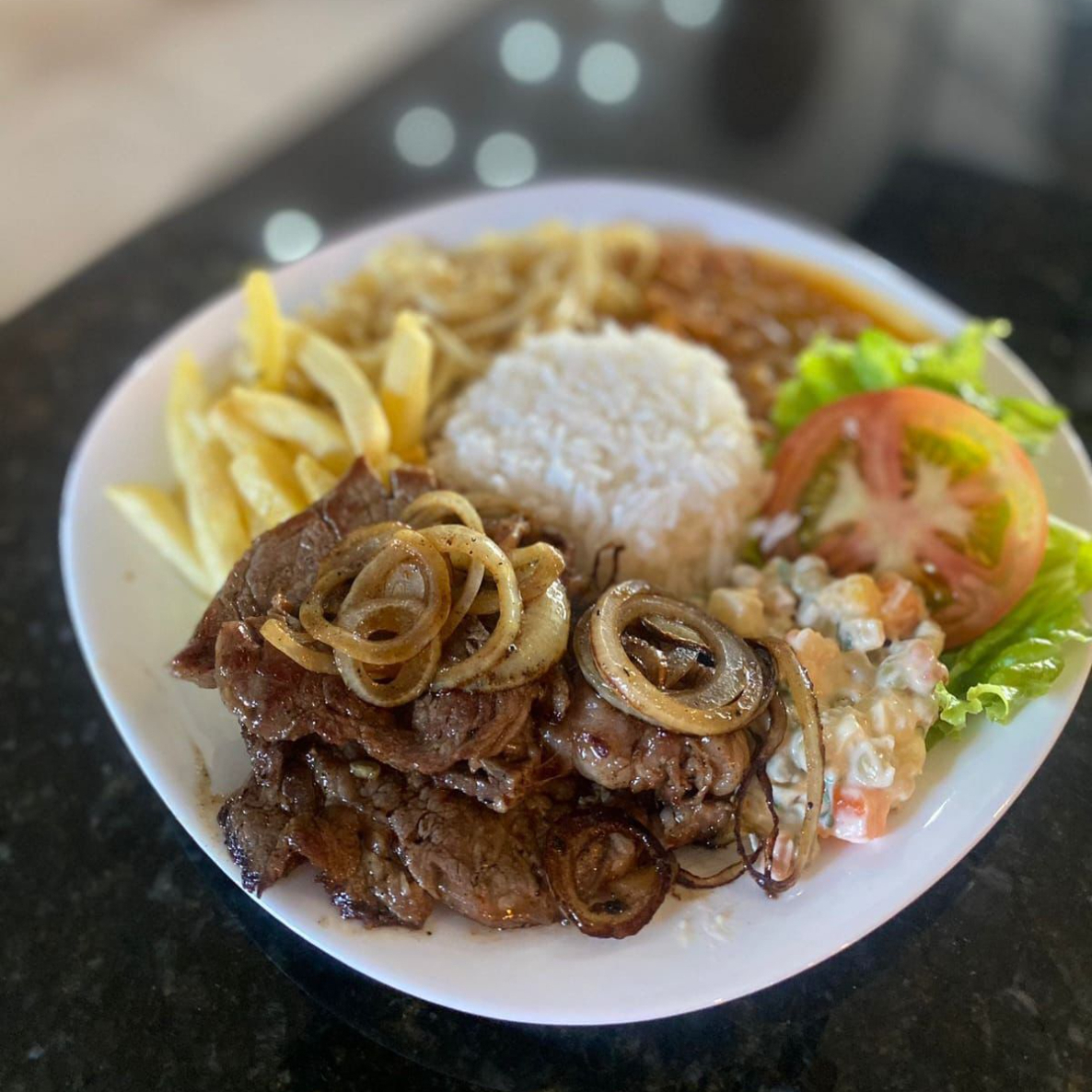Arroz,feijão carioca,macarrão,batata frita,salada e bife de picanha