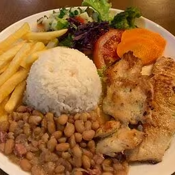Arroz,feijão carioca,macarrão,batata frita,salada e filé de frango