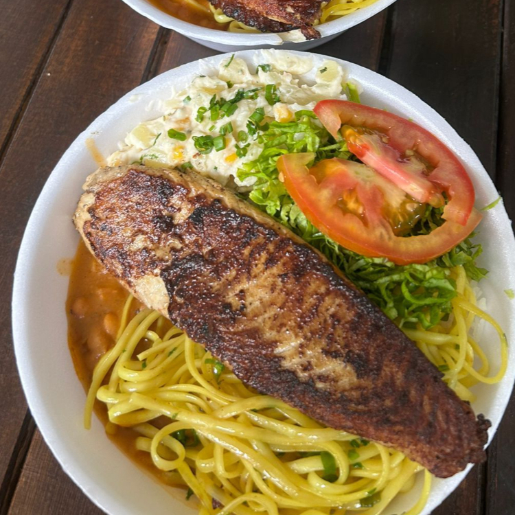 Arroz branco, feijão carioca, macarrão, batata frita, salada e filé de tilápia