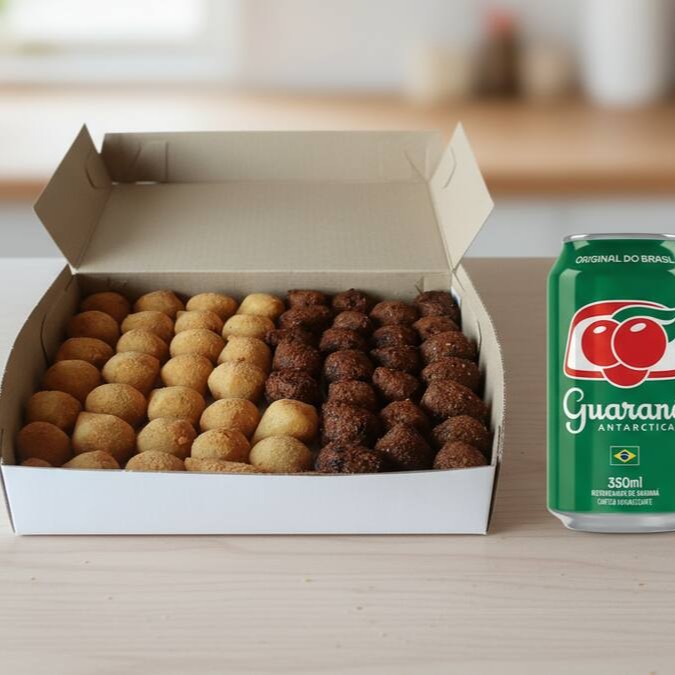Celebre em grande estilo com nosso combo de 100 salgados variados! Desfrute de uma seleção irresistível, que inclui coxinha de frango, Trouxinha de milho e muçarela, kibe, medalhão de salsicha, bolinha de Presunto e Muçarela e Trouxinha de carne. Personalize seu combo escolhendo seus sabores preferidos, sendo que cada escolha equivale a 10 salgados.