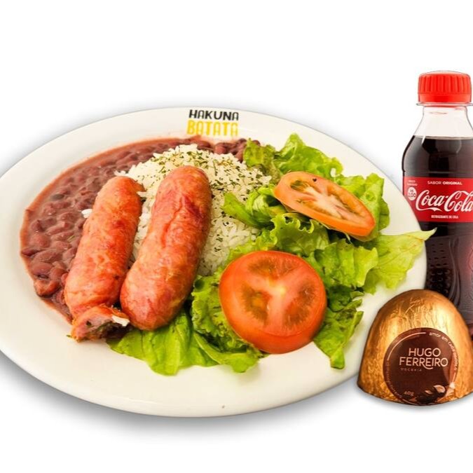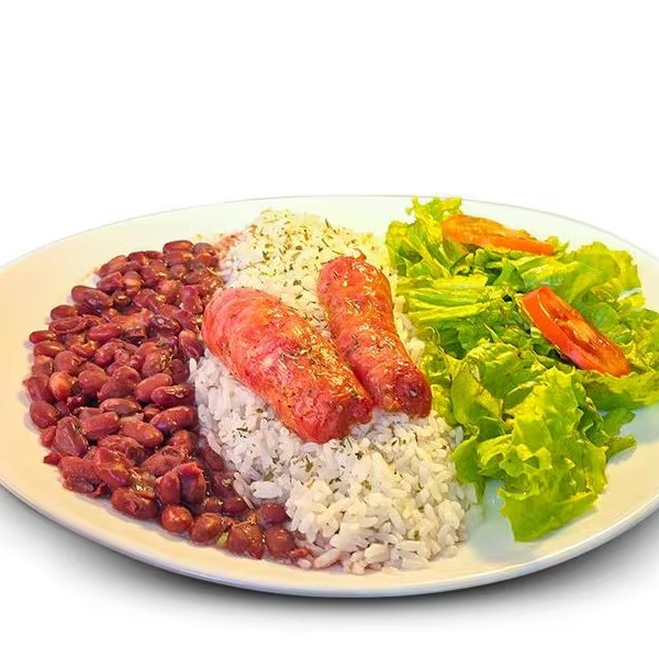 Uma linguiça toscana frita, arroz soltinho, feijão e salada fresca de alface e tomate. Sabor caseiro e irresistível.