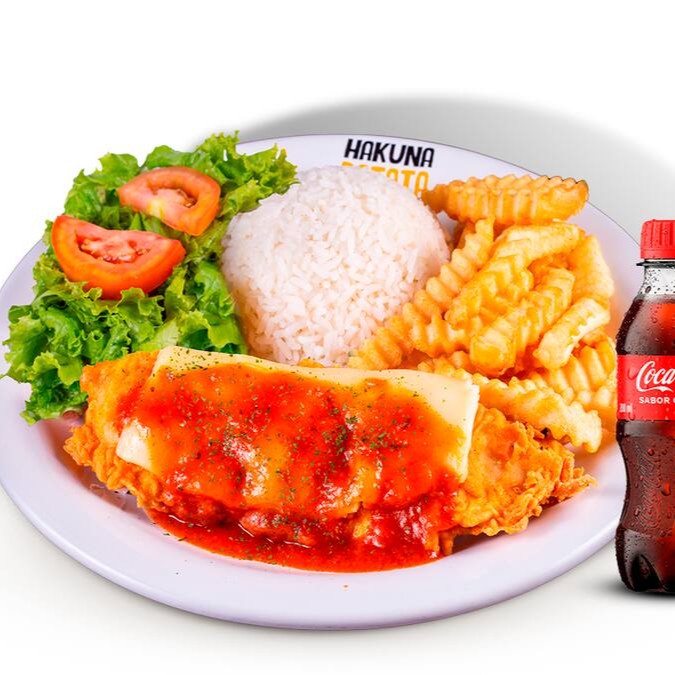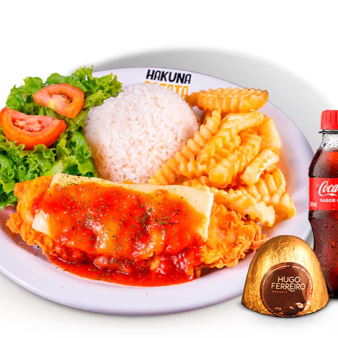 Parmegiana de frango com batata frita, acompanhado de uma mini coca e uma trufa artesanal