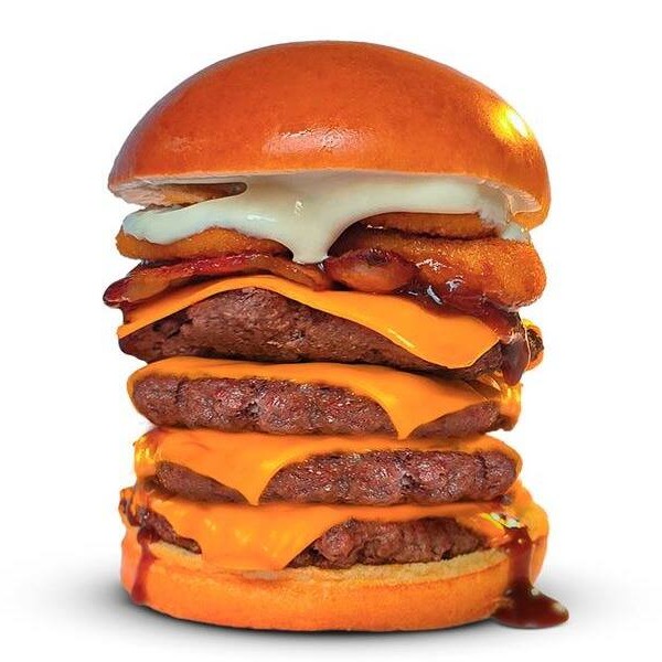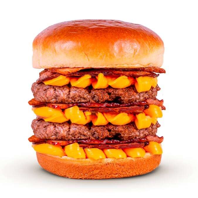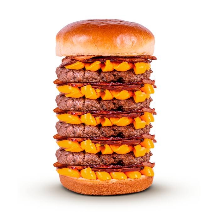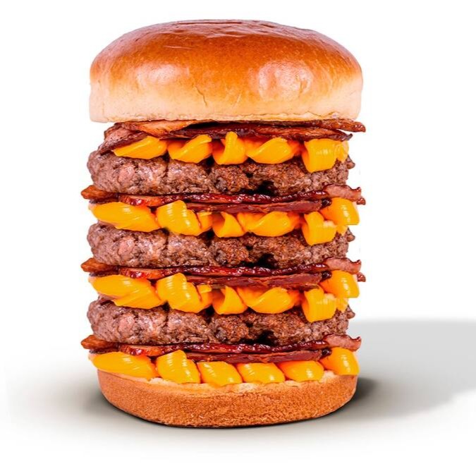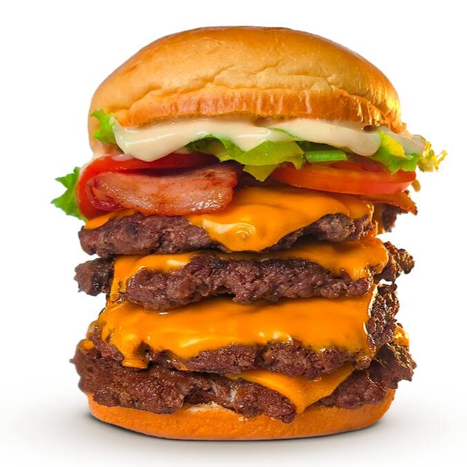 Pão de brioche, 2x bacon, 2x cheddar cremoso, maionese Hakuna e triplo burguer smash 70g.