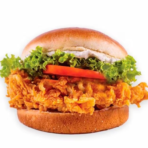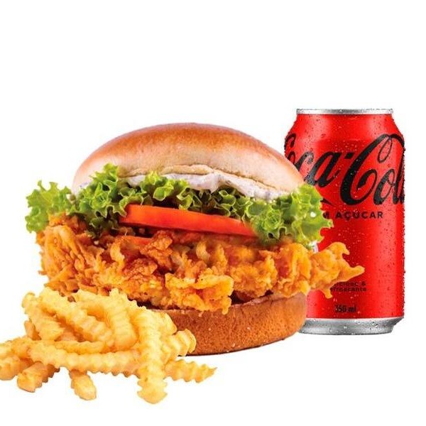 Pão de brioche, filé de frango empanado, deliciosa maionese Hakuna e salada