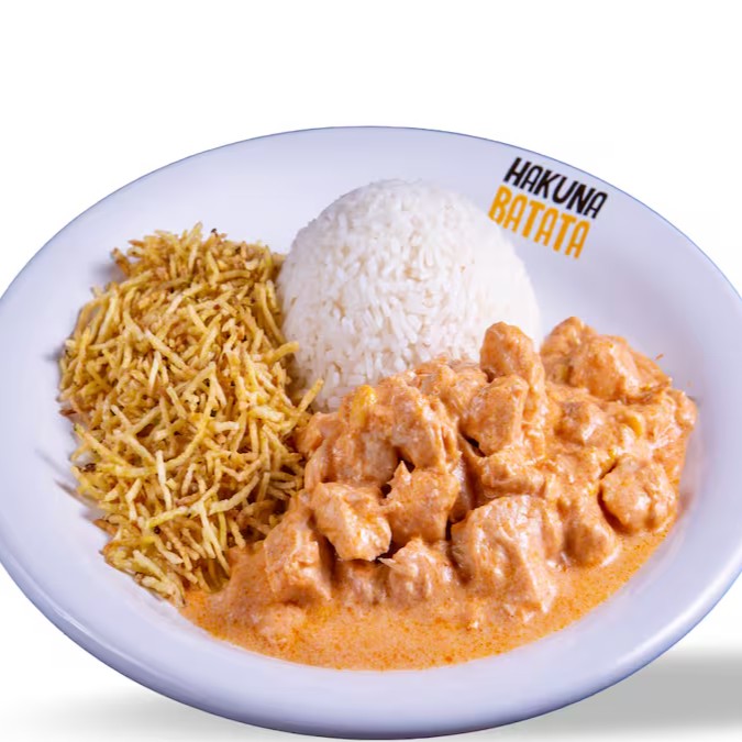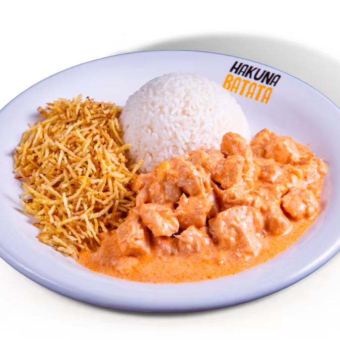 Strogonoff de frango, arroz e batata a sua escolha.