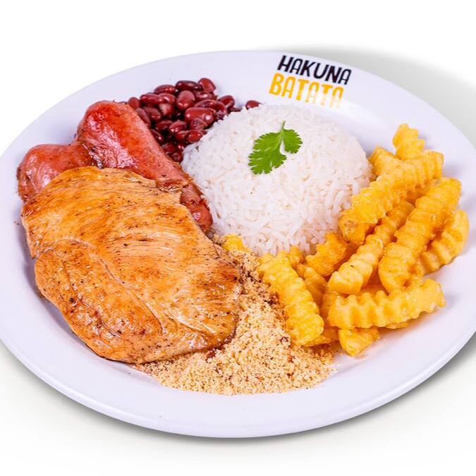Filé de peito de frango na chapa 100g e linguiça toscana na chapa, arroz, farofa, feijão e batata a sua escolha.