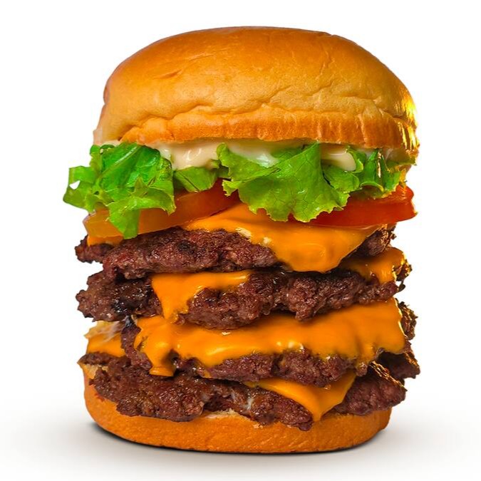 Pão de brioche, maionese Hakuna, salada, bacon, cheddar fatiado e quatro burguer smash 70g.
