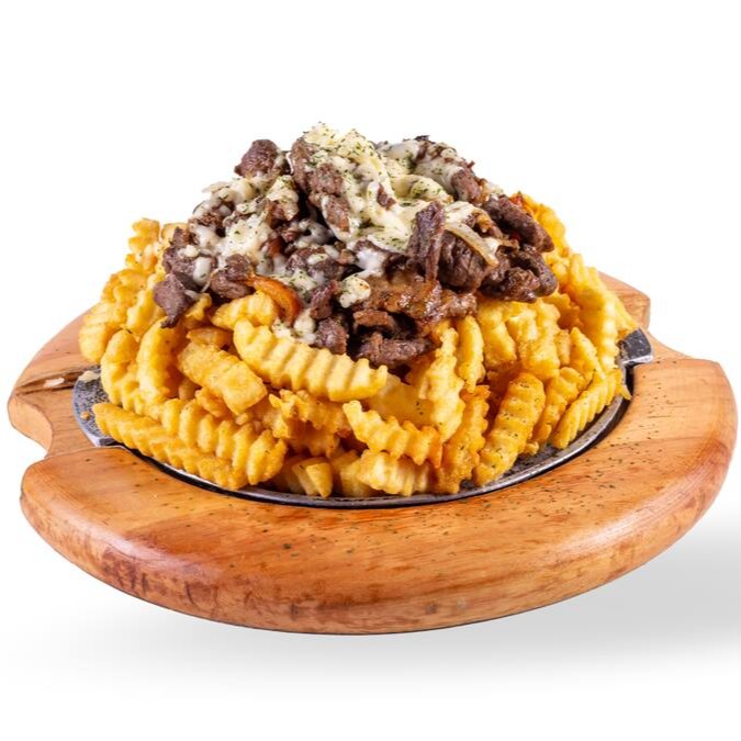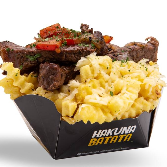Tiras de contrafilé, queijo muçarela, tomate, cebola e Hakuna Batata.
