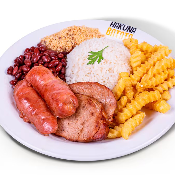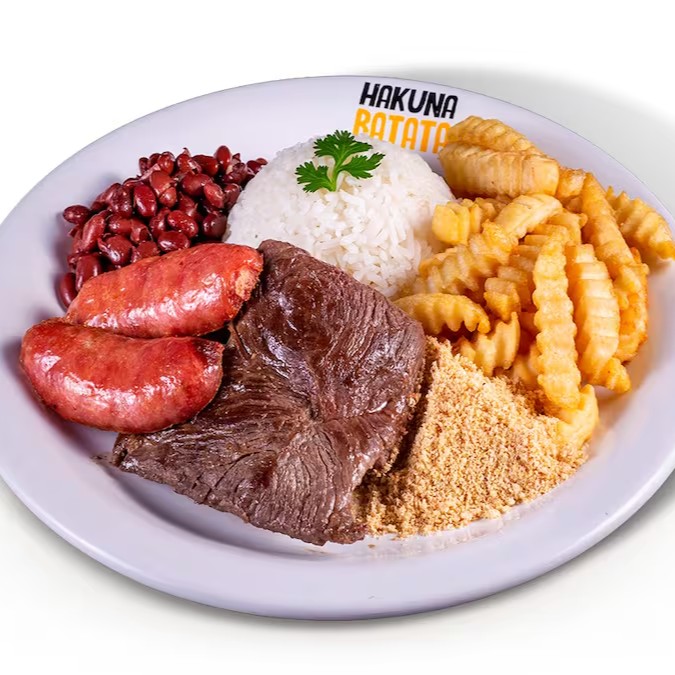 Contrafilé bovino 100g, linguiça toscana na chapa, arroz, farofa, feijão e batata a sua escolha.