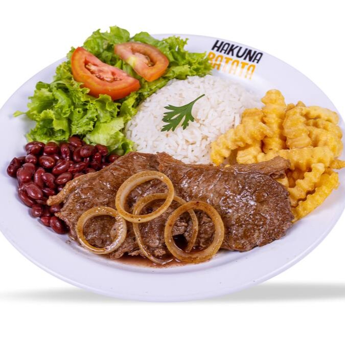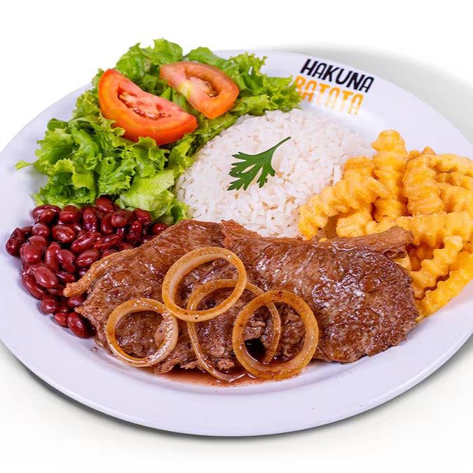 Contrafilé bovino acebolado, acompanhado de arroz, feijão, salada simples (alface e tomate) e batata a sua escolha.