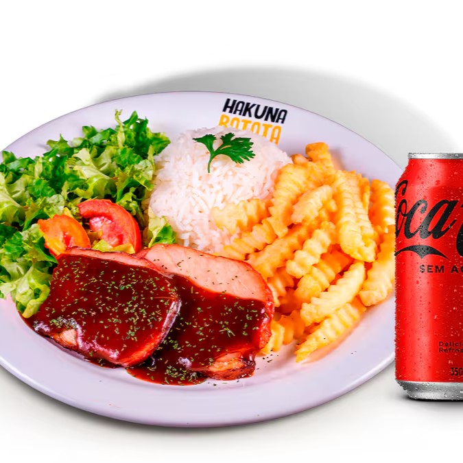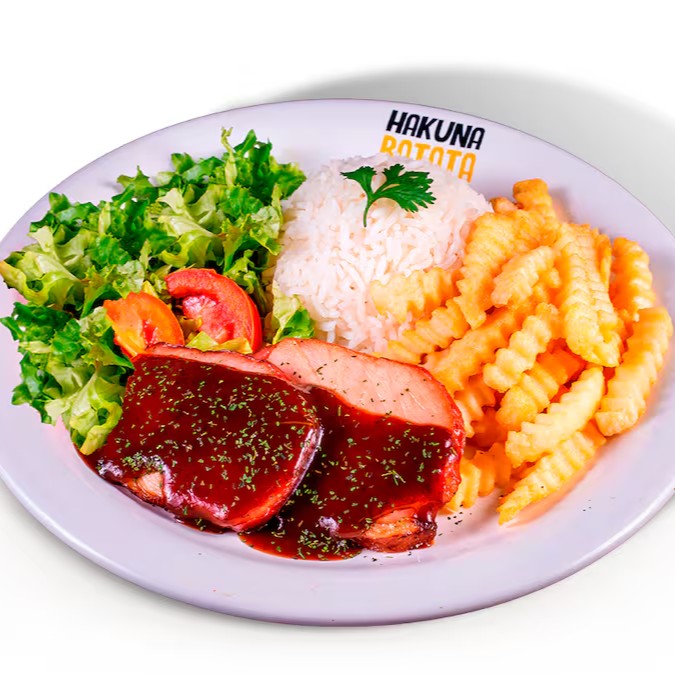 Lombo suíno coberto com molho barbecue. Acompanha arroz branco, salada simples (alface e tomate) e batata a sua escolha