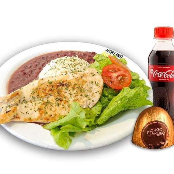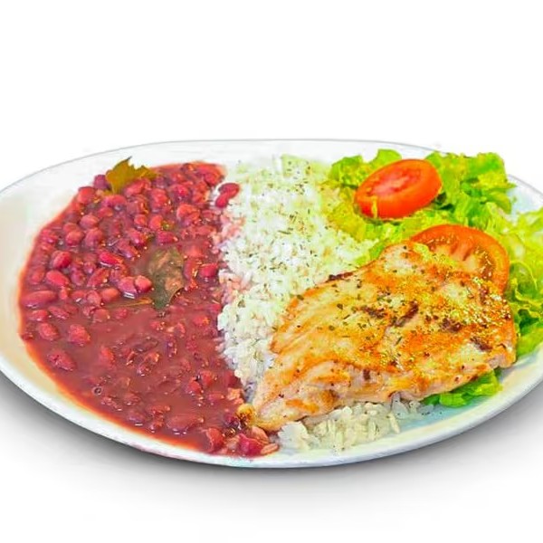 Filé de frango grelhado, arroz, feijão e salada.