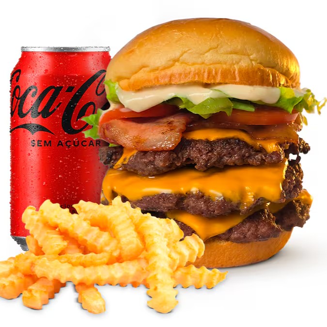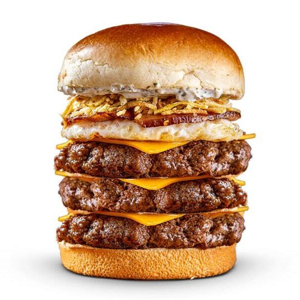 Pão de brioche, maionese de alho, batata palha, bacon, ovo, cheddar fatiado e triplo burguer smash 70g.
