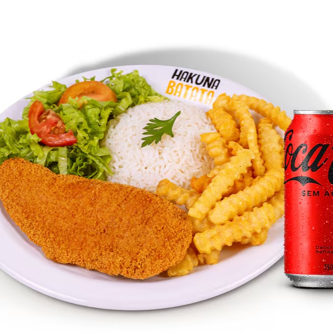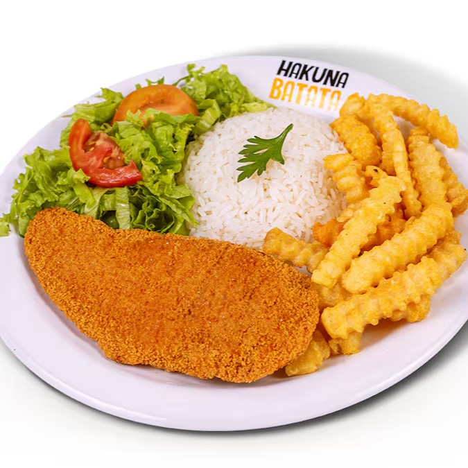 Filé de frango empanado, arroz, salda simples (alface e tomate) e batata a sua escolha.