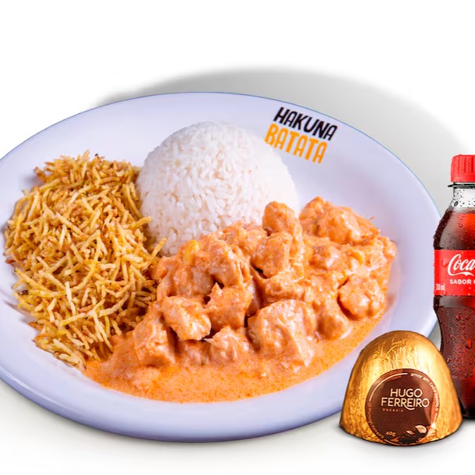 Delicioso Strogonoff de frango com batata palha, acompanhado de uma mini coca e uma trufa artesanal