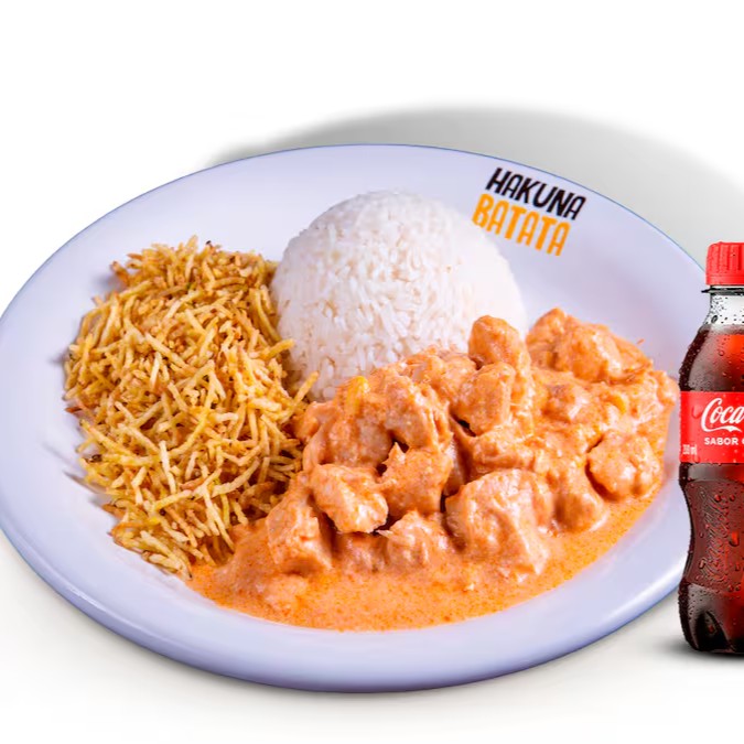 Strogonoff de frango, arroz e batata palha. Acompanha uma coca mini.