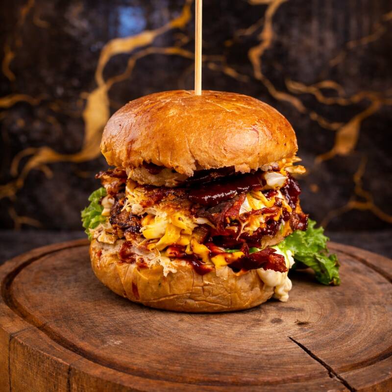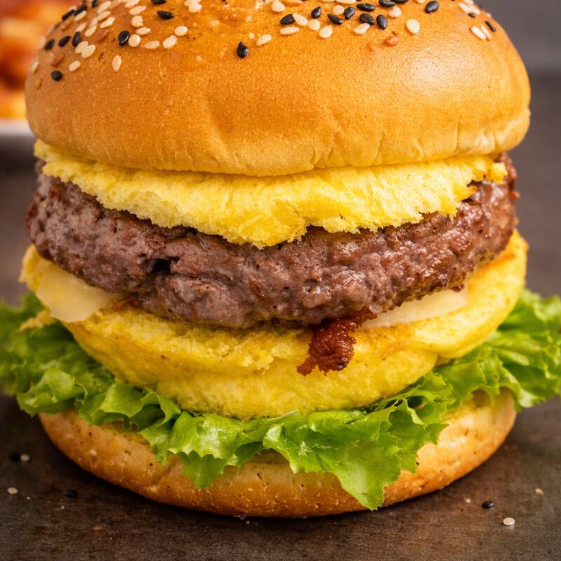 Pão de brioche com gergelin, queijo muçarela, carne blend artesanal , frango, Molho Especial, abacaxi grelhado, alface, tomate, bacon selecionado e ovo.