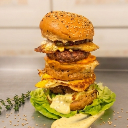 Pão de brioche com gergelin, 3 carnes blend artesanal , 2 ovos ,frango, queijo muçarela Molho Especial, abacaxi grelhado, alface, tomate, bacon, pesto de manjericão.