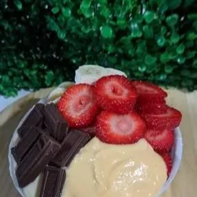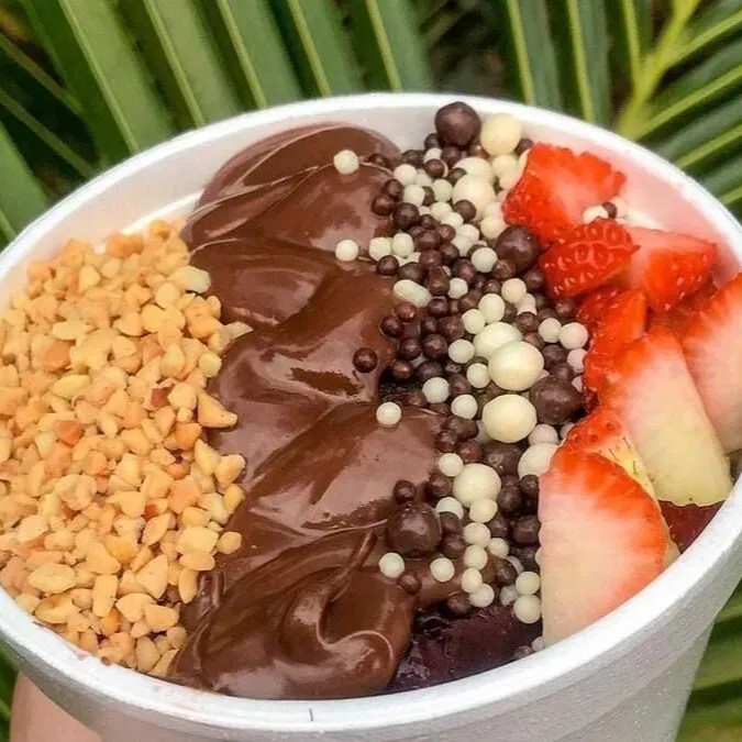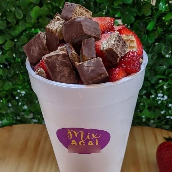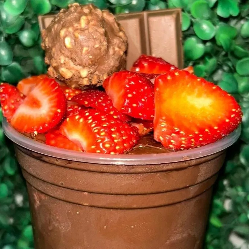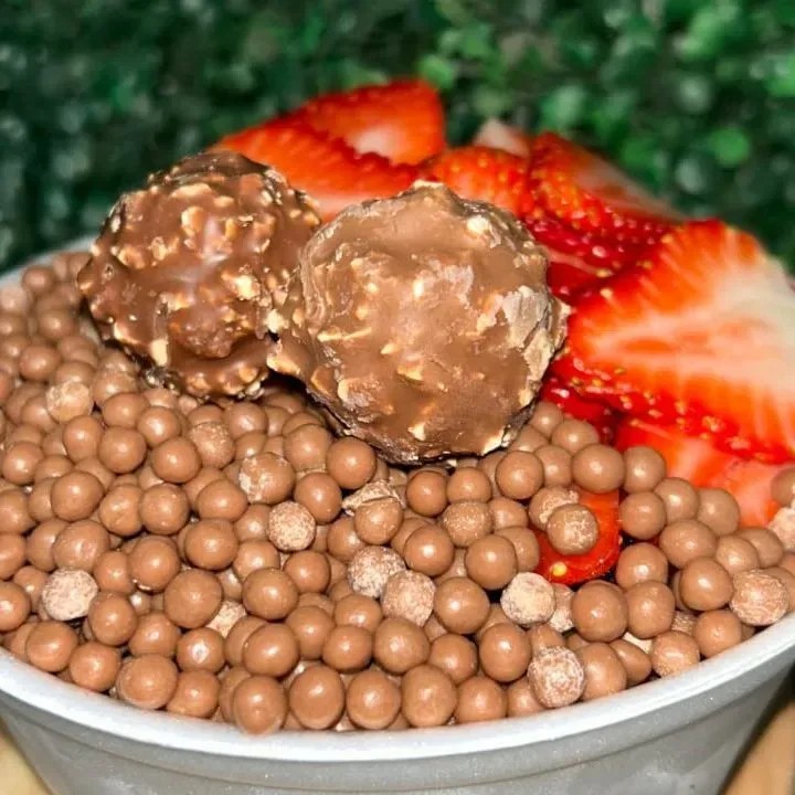 Cumbuca de 500 ml Açaí Leite em pó Chantily Creme de morango Chocolate Ouro Branco Calda de morango Confete