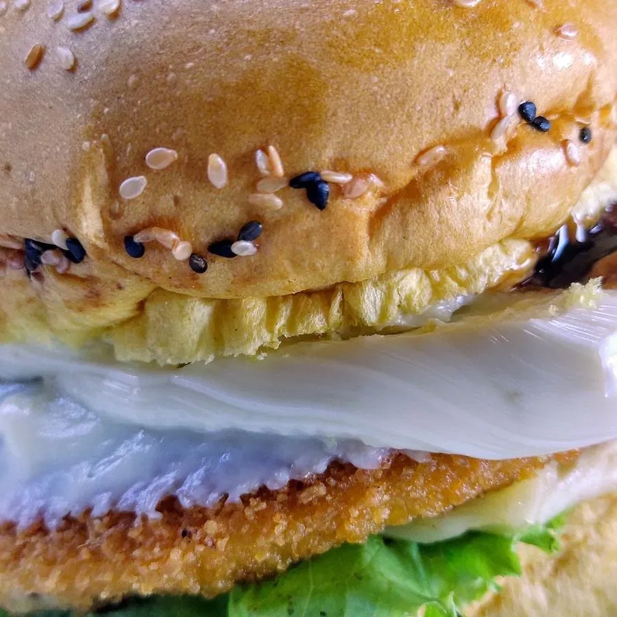 Pão de brioche 2 hambúrguer de frango 90 grs Requeijão Salada Molho verde