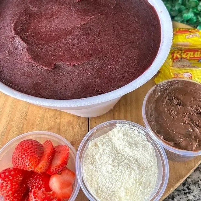 1 kilo de creme de açaí ,morangos frescos ,leite em pó,Nutella ,3 paçocas .Os complementos vão separados