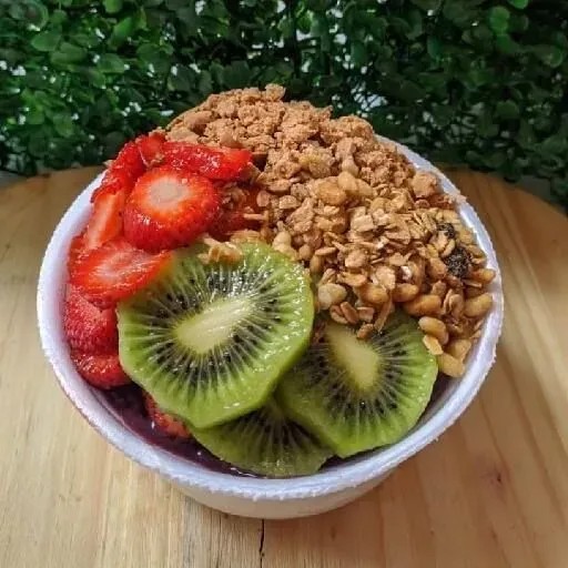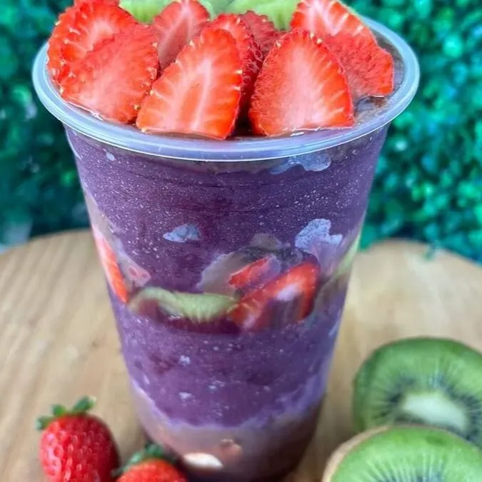 Marmita de 500 ml de acai Leite condensado Leite em po Paçoca Granola Morango kiwi.