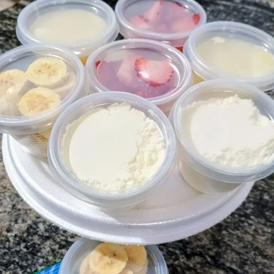 Marmita de 500 ml com creme de acai Leite em po Morangos Banana Creme de maracuja Creme Ninho Chocolate ao leite ..