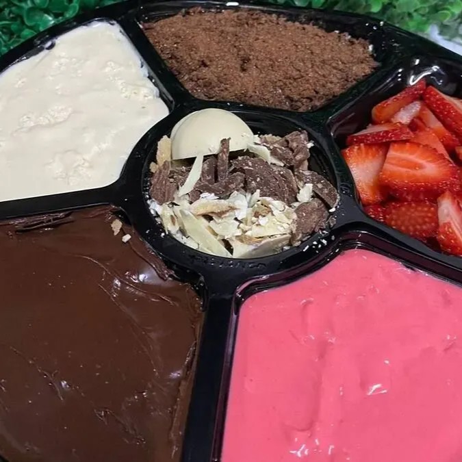Marmita de 500 ml , leite condensado , leite em po , Nutella , chantily , gotas e morangos frescos