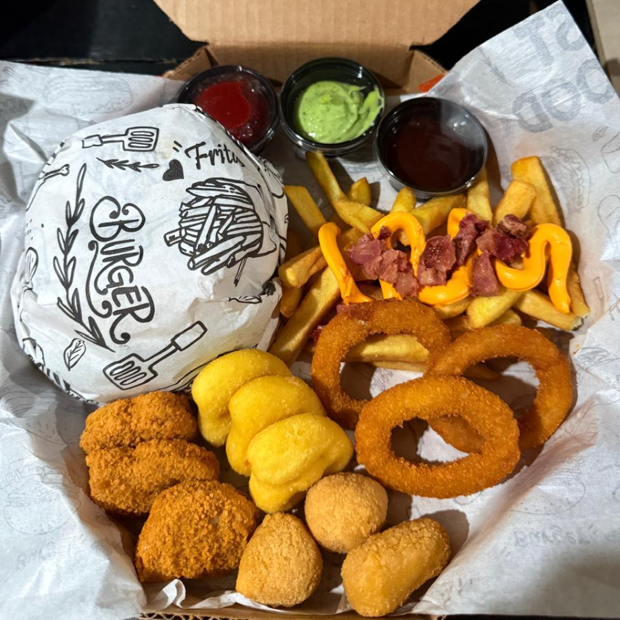 1 Hamburguer , 100g fritas com cheddar e bacon, 3 anel de cebola ,3 nugget,3 batata carinha , 3 mandioquinha . OBSERVAÇÃO ; AS BATATAS PODEM CHEGAR MURCHAS DEVIDO A EMBALAGEM FECHADA