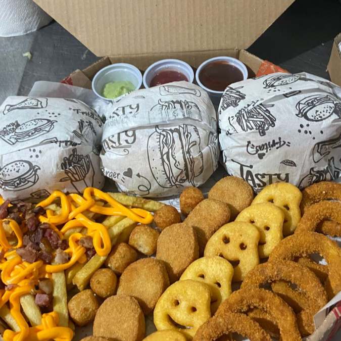 3 Hamburguer , 150g de fritas cm cheddar e bacon , 6 anel de cebola , 6 nugget , 6 batata carinhas , 6 mandioquinha . OBSERVAÇÃO ; AS BATATAS PODEM CHEGAREM MURCHAS DEVIDO A EMBALAGEM FECHADA .