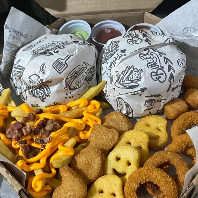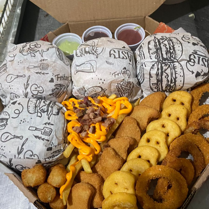 2 Hamburguer , 130g de fritas com cheddar e bacon , 4 anel de cebola , 4 nugget , 4 batata de carinhas , 4 mandioquinha . OBSERVAÇAO ; AS BATATAS PODEM CHEGAREM MURCHAS DEVIDO A EMBALAGEM FECHADA