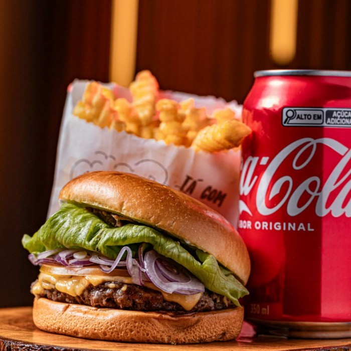 Pão de Brioche Tostado na Chapa com Manteiga, Burger de 100Gr, Queijo, Bacon, Cebola Caramelizada. Molho especial + BATATA + COCA COLA 350ML