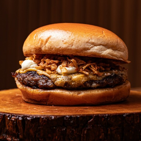 Pão de Brioche Tostado na Chapa com Manteiga, Um Burger de 100gr, Queijo, Cebola Crispy, Molho especial (SEM BATATA FRITA).