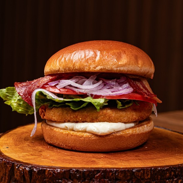 Pão de Brioche Tostado na Chapa Com Manteiga, Hamburguer de Frango, Alface, Tomate, Cebola Roxa, bacon, Molho especial