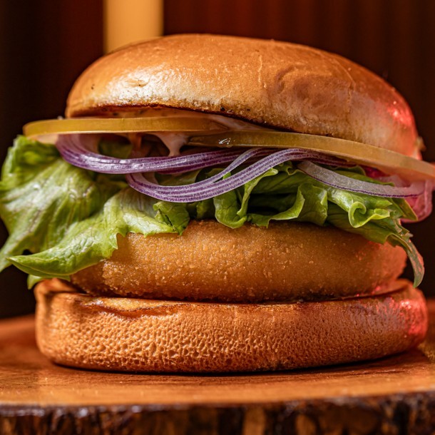 Pão de Brioche Tostado na Chapa com Manteiga, Disco de Queijo Empanado, Tomate, Alface, Cebola Roxa, Molho especial, (SEM BATATA FRITA)