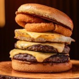 Pão de Brioche Tostado na Chapa com Manteiga, Dois Burger de 100gr, Queijo, Ovo, Anéis de Cebola, Molho especial +BATATA + BEBIDA